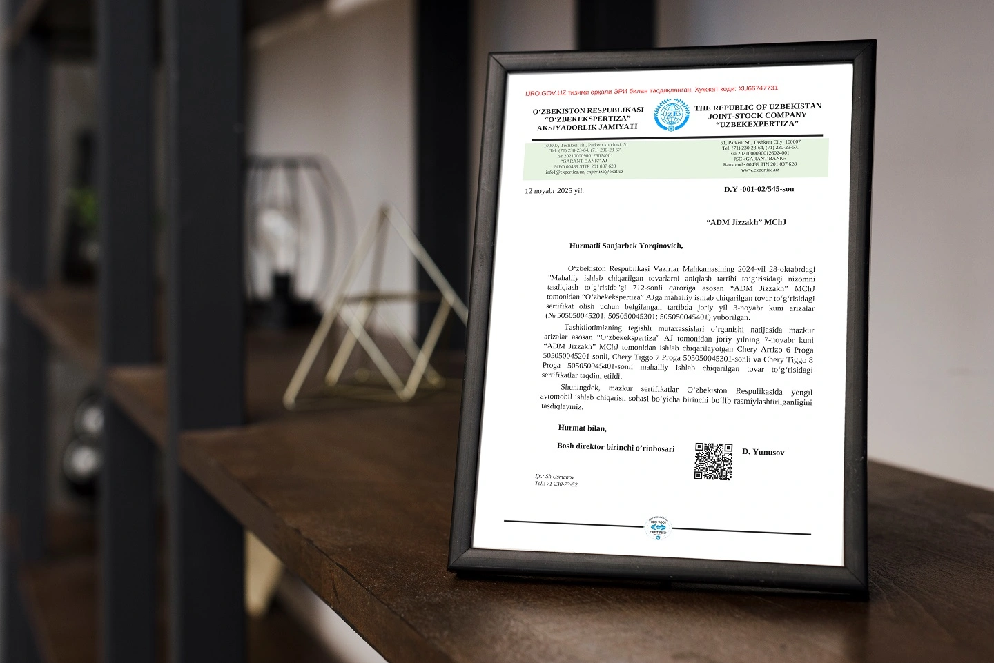 Теперь наличие официального сертификата позволяет государственным компаниям и организациям закупать автомобили ADM Jizzakh в соответствии с требованиями законодательства о местном производстве.