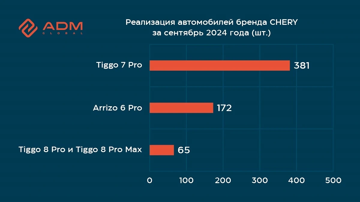 В сентябре 2024 года было продано 618 автомобилей моделей Arrizo 6 Pro, Tiggo 7 Pro, Tiggo 8 Pro и Tiggo 8 Pro Max, сообщает группа компаний ADM Global, официальный дистрибьютор CHERY в Узбекистане. Tiggo 7 Pro сохранил лидерство среди автомобилей CHERY в Узбекистане, как и в августе. В сентябре реализовано 381 кроссовер, что составляет 61,7% от общего объема продаж. Это на 9,4% больше, чем в августе 2024 года.