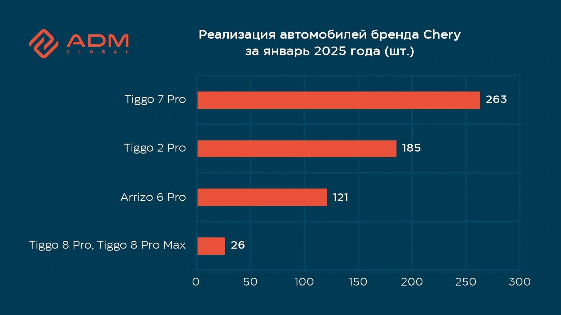 Среди наиболее востребованных моделей лидирует кроссовер Chery Tiggo 7 Pro, реализованный в количестве 263 единиц. Данный автомобиль привлек внимание покупателей благодаря сочетанию современных технологий, комфорта и динамических характеристик.