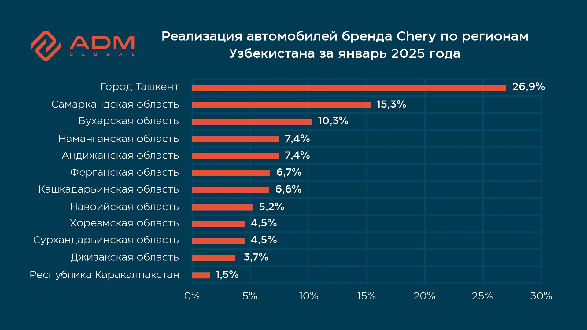 Наибольший объем реализации автомобилей Chery зафиксирован в Ташкенте – 26,9% от общего количества. Следом идут Самаркандская область (15,3%), Бухарская область (10,3%), Наманганская и Андижанская области, каждая из которых обеспечила по 7,4% от общего объема. На остальные регионы страны пришлось 32,7% реализованных автомобилей.