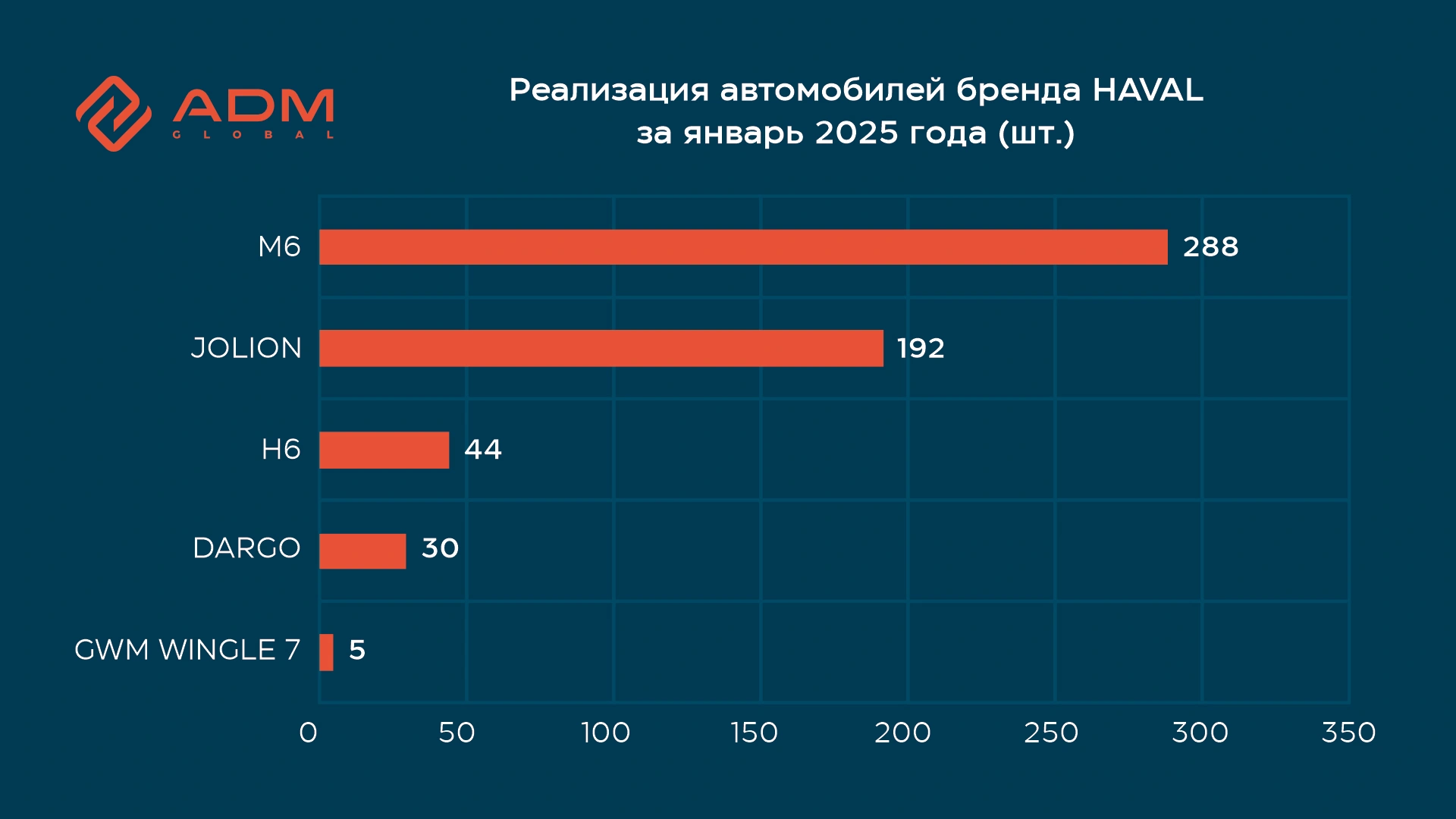 - HAVAL M6 – абсолютный лидер месяца с 288 проданными автомобилями. Просторный салон, экономичный двигатель и современные технологии делают его выбором номер один среди автолюбителей.