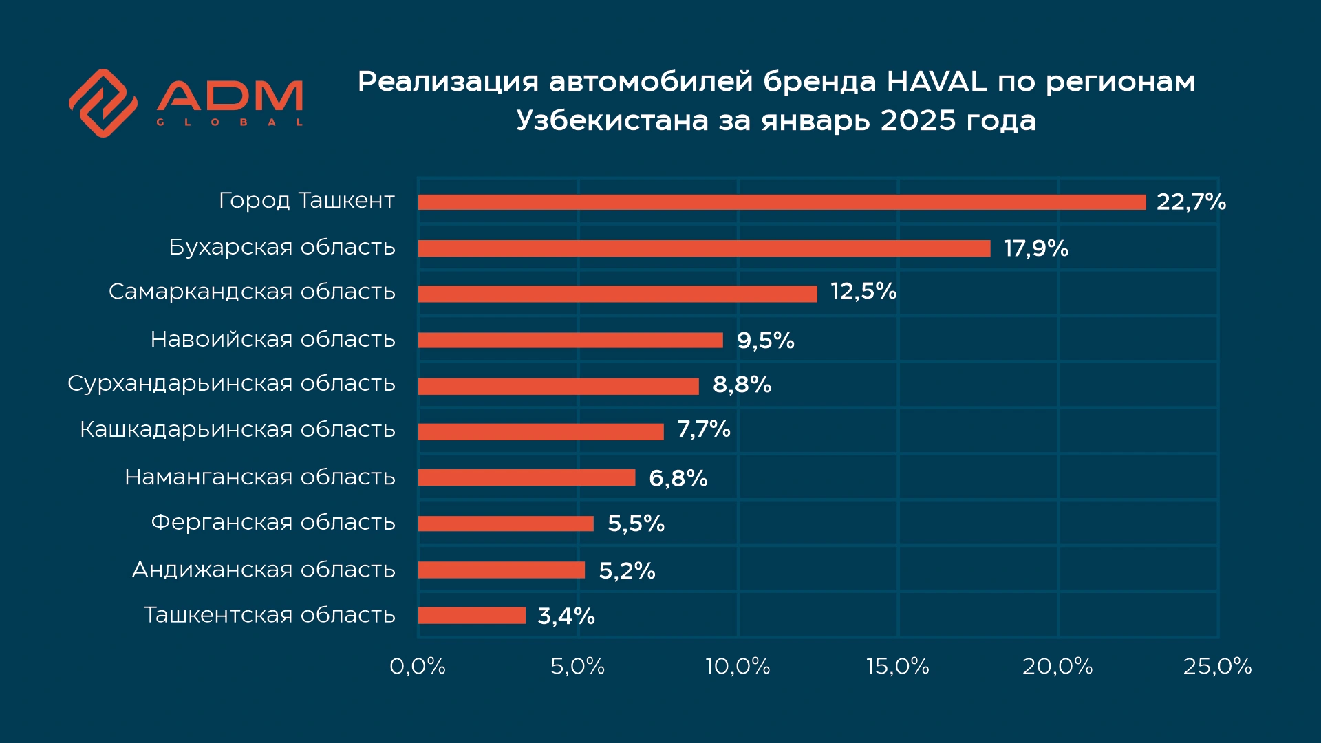 В январе 2025 года на автомобильном рынке Узбекистана было реализовано 559 автомобилей бренда HAVAL (Great Wall Motor). Эти показатели подтверждают высокий спрос на надежные и современные кроссоверы и пикапы среди покупателей.