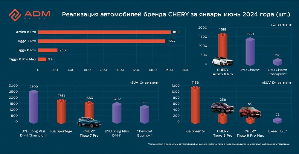 С января по июнь 2024 года в Узбекистане было продано более 179 тыс. автомобилей различных брендов. Группой компаний ADM Global реализовано 11407 автомобилей: 7112 – Kia, 3507 – CHERY и 788 – HAVAL.