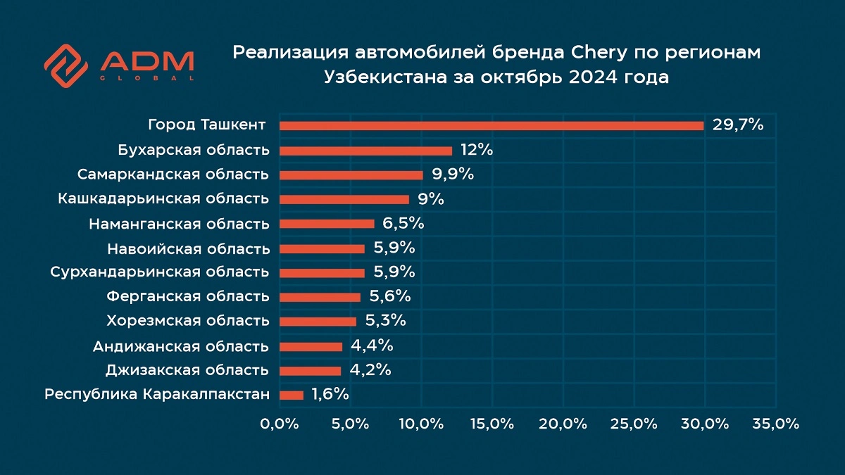 По итогам октября 2024 года наибольшую долю реализованных автомобилей Haval продемонстрировал Ташкент – 26,2% от общего объема, обойдя Бухарскую область с показателем 21,2%. За ними расположились Самаркандская область с 14,2%, Сурхандарьинская область с 10,5%, Андижанская область с 9,7%, Навоийская область с 8,9%, Наманганская область с 6,0% и Ферганская область с 3,3%.