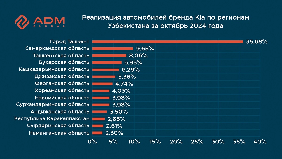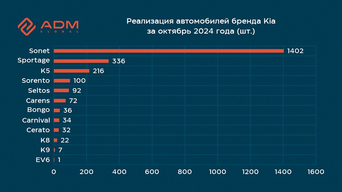 В октябре 2024 года реализация автомобилей бренда Kia на рынке Узбекистана продемонстрировала отличные результаты – 2350 единиц, сообщает группа компаний ADM Global. Внимание покупателей сосредоточено на кроссоверах, которые идеально сочетают в себе современные технологии, комфорт и проходимость. Лидером продаж стал компактный и экономичный кроссовер Kia Sonet, который занял значительную долю от общего числа реализованных моделей Kia.