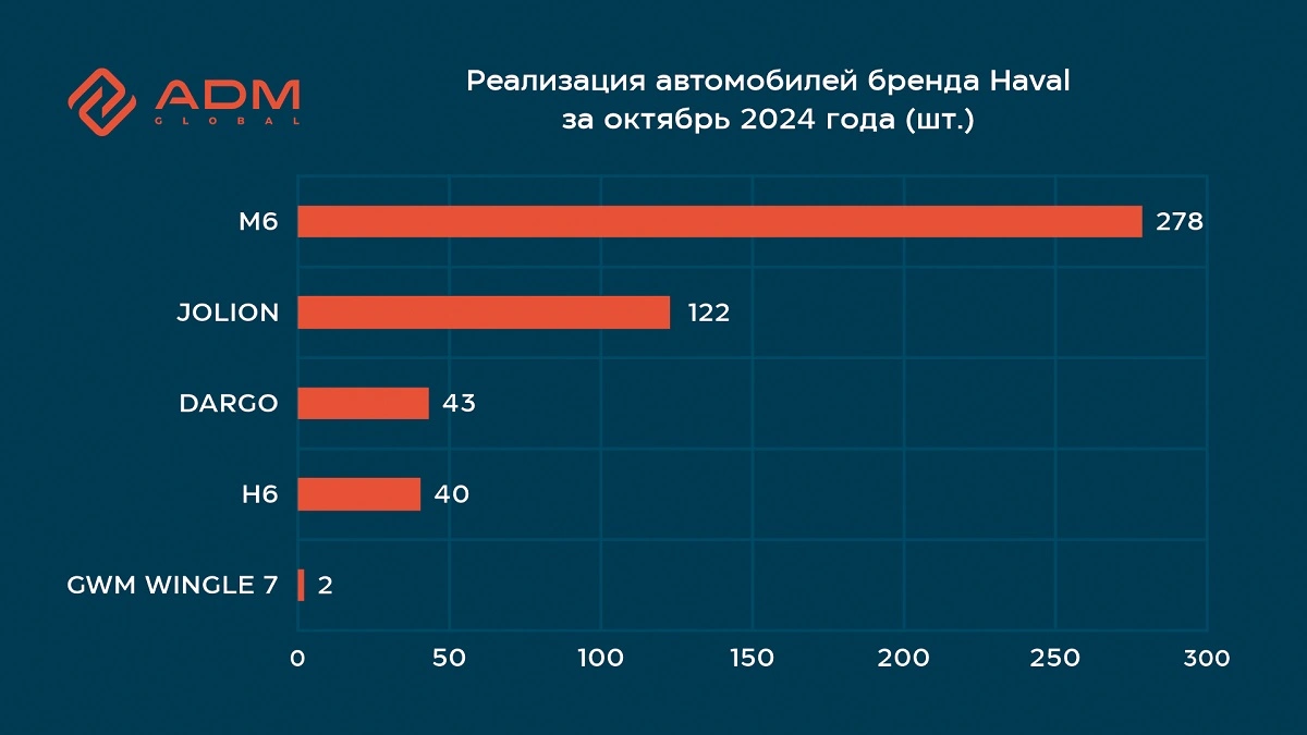 Согласно итогам октября 2024 года было реализовано 485 автомобилей Haval M6, Jolion, H6 и Dargo, что на 5% больше по сравнению с сентябрем того же года.