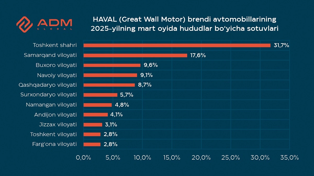 O‘zbekistonda HAVAL brendi avtomobillari sotuvining eng katta hajmi poytaxtga to‘g‘ri keldi - Toshkentda umumiy hajmning 31,7 foizi sotilgan. Ikkinchi o‘rinda 17,6 foiz ulush bilan Buxoro viloyati, keyingi o‘rinlarda Samarqand (9,6 foiz), Navoiy (9,1 foiz) va Qashqadaryo (8,7 foiz) viloyatlari qayd etilgan. Qolgan hududlar sotuvning 23,3 foizini ta’minladi.