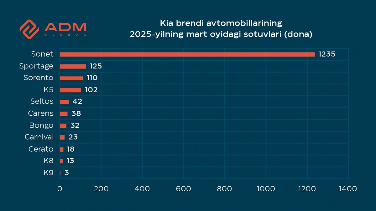 2025-yilning mart oyida O‘zbekistonda Kia brendining 1650 dona avtomobillari sotildi. Bu xususiy va korporativ mijozlar tomonidan brendga bo‘lgan barqaror qiziqishning tasdig‘idir.